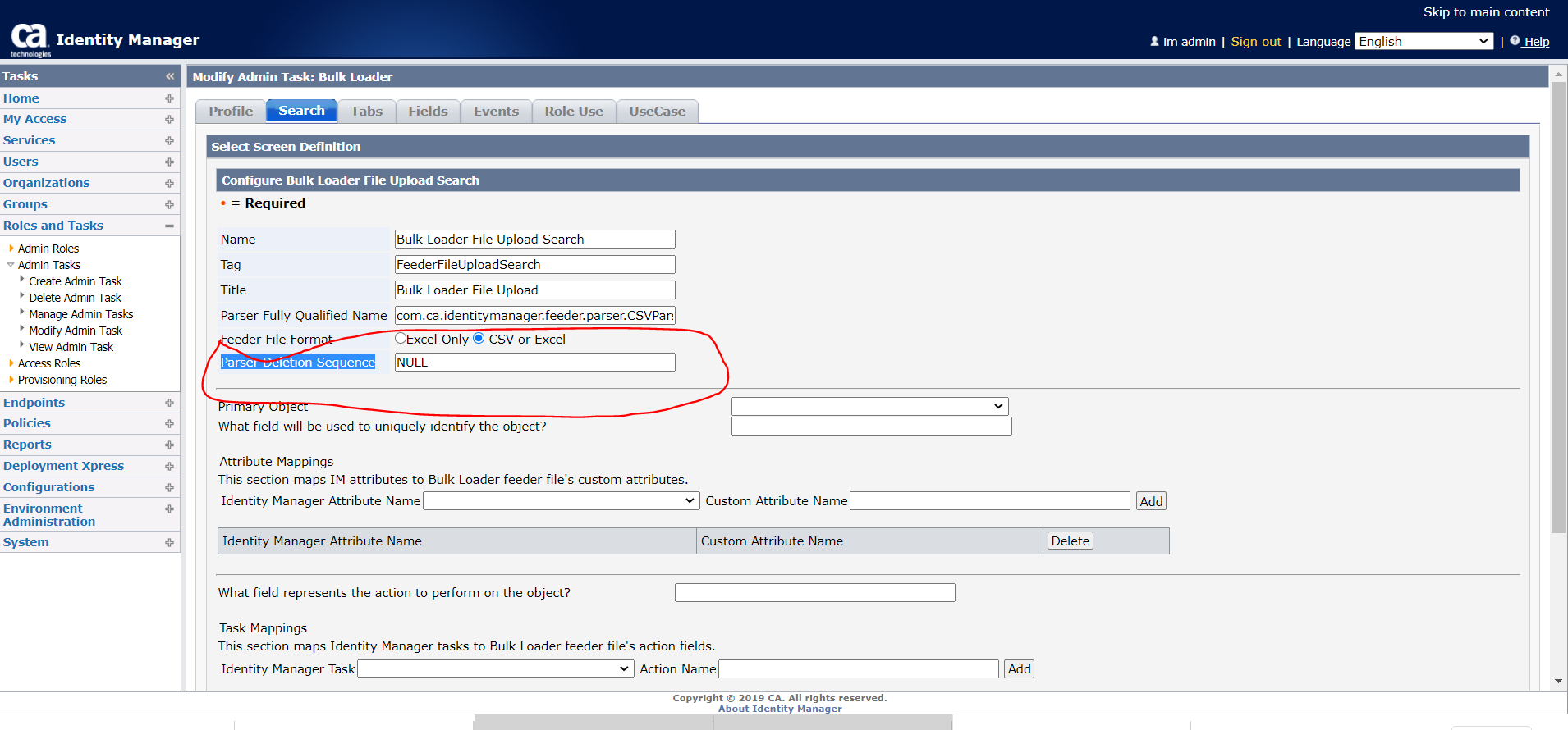 Parser Deletion Sequence Sets deletion sequence string which is used to determine which value in the parsed file should be deleted from the managed object later. For example if the deleteSequence is set to "**NULL**" then the parser will return in getNextRecord() a list for a single record in which null will appear for each "**NULL**" value in the record and "" will appear for each attribute which should be ignored when setting a managed object.