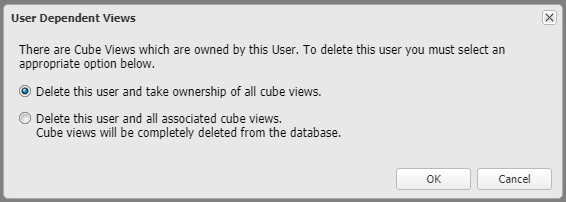 When attempting to delete an IT Analytics (ITA) user from within the Security security settings tab, you are first prompted to either take ownership of the user's views or delete them: