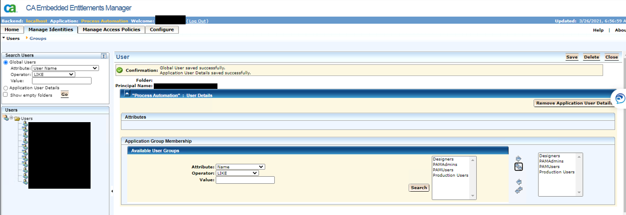 2. Go to Manage Identities > Users > Search for the user > click on the user> Click on Add Application User Details> Click on Search > Move group(s) from left to right > Save.