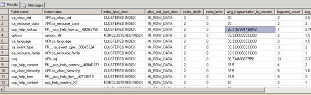 SELECT t.NAME 'Table name', i.NAME 'Index name', ips.index_type_desc, ips.alloc_unit_type_desc, ips.index_depth, ips.index_level, ips.avg_fragmentation_in_percent, ips.fragment_count, ips.avg_fragment_size_in_pages, ips.page_count, ips.avg_page_space_used_in_percent, ips.record_count, ips.ghost_record_count, ips.Version_ghost_record_count, ips.min_record_size_in_bytes, ips.max_record_size_in_bytes, ips.avg_record_size_in_bytes, ips.forwarded_record_count FROM sys.dm_db_index_physical_stats(DB_ID(), NULL, NULL, NULL, 'DETAILED') ips INNER JOIN sys.tables t ON ips.OBJECT_ID = t.Object_ID INNER JOIN sys.indexes i ON ips.index_id = i.index_id AND ips.OBJECT_ID = i.object_id WHERE AVG_FRAGMENTATION_IN_PERCENT > 0.0 ORDER BY AVG_FRAGMENTATION_IN_PERCENT, fragment_count