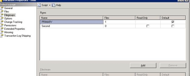 ALTER DATABASE [MDB] ADD FILEGROUP [Second]