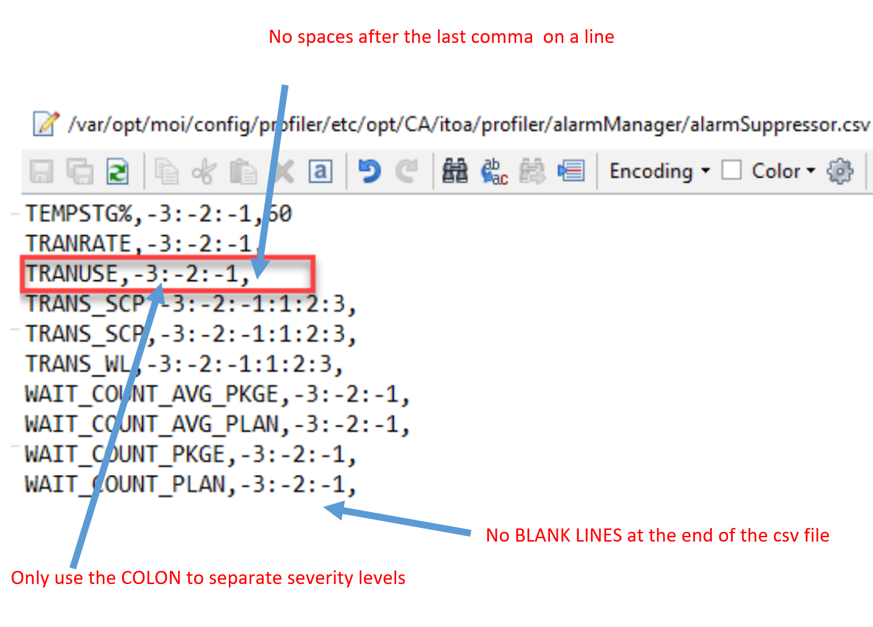 If this line is missing from the alarmSuppressor.csv file, alert suppression will not occur at all and the following error messages will be repeated over and over in the profiler-alarm-manager.log located