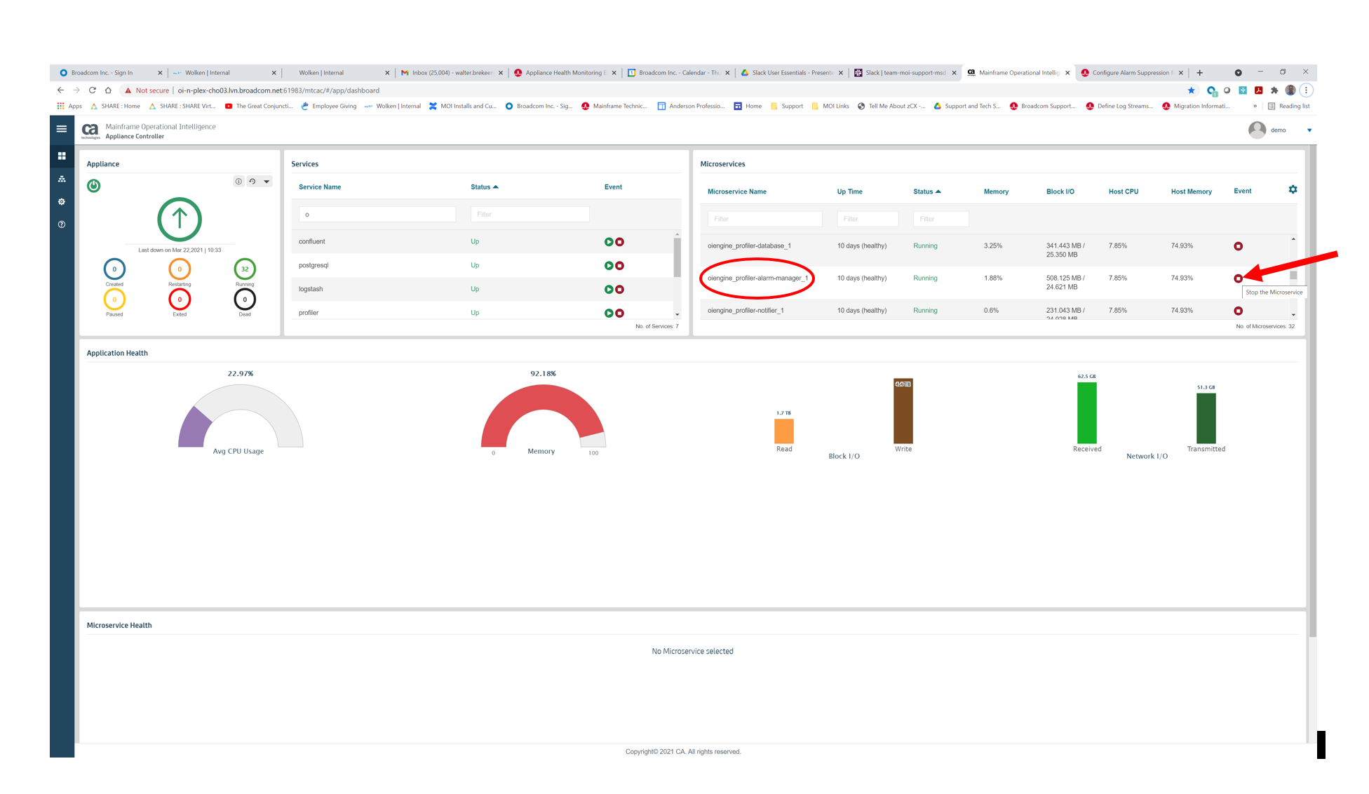 Please stop and start the alarm manager microservice using the MTCAC UI as shown below to ensure your changes are applied. Please wait until the alarm manager microservice starts up and reaches a healthy status to verify the alarm suppression entries are working.