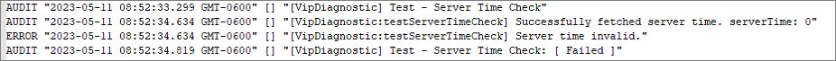AUDIT "2020-12-11 22:17:49.822 GMT-0600" "[VipDiagnostic:testServerTimeCheck] Time difference between serverTime and localTime is 0 seconds"