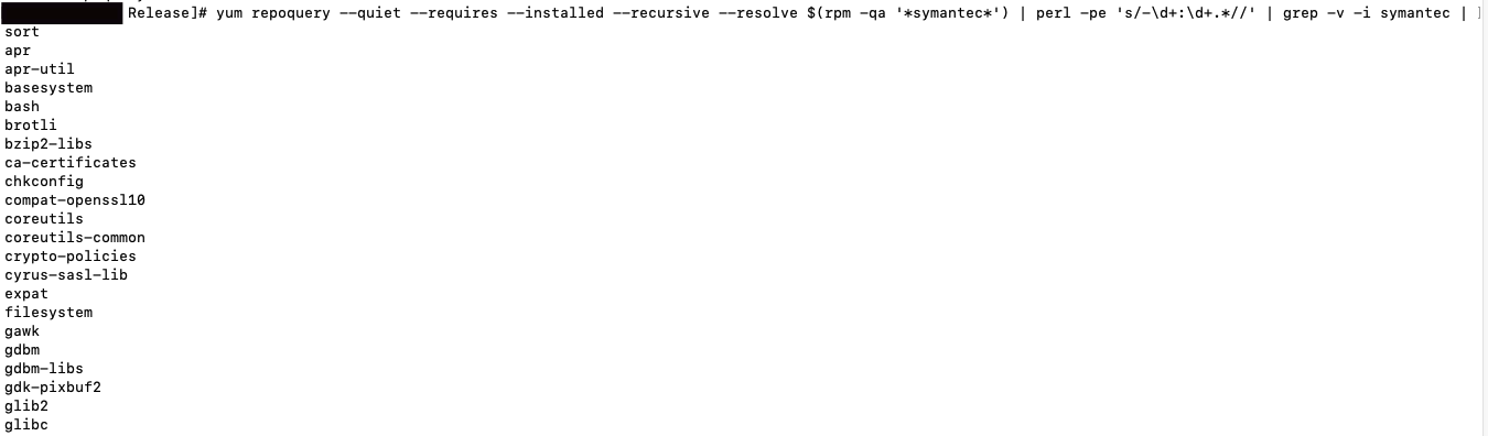 yum repoquery --quiet --requires --installed --recursive --resolve $(ls *.rpm) | sed 's/-[0-9]\+:[0-9]\+.*//' | grep -v -i symantec | uniq| sort