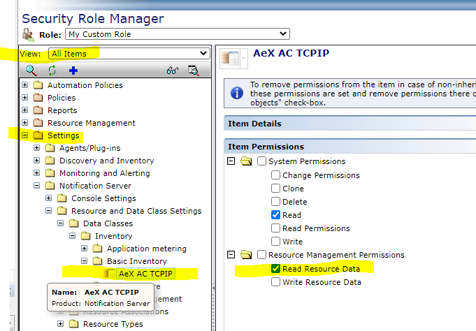On the right pane under Item Permissions, select Read Resource Data under Resource Management Permissions