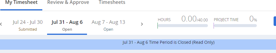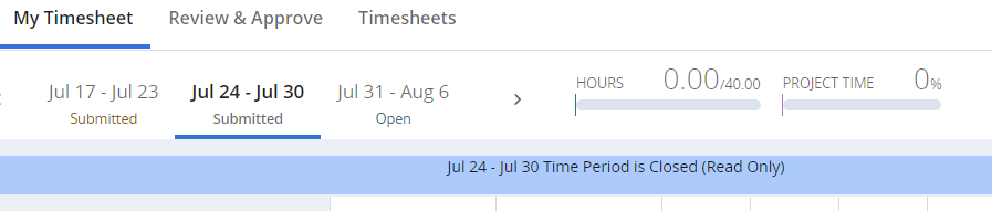 When navigating on the timesheet carousel you can see the timesheets from Closed Time Periods along with their status. There is a banner on the timesheet itself informing the period is closed.