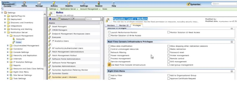 In the Symantec Management Console, in the left panel, go to Settings>All Settings>Notification Server>Account Management>Roles (in blue below). In the middle panel, choose Symantec Level 1 Workers (in yellow below). Finally, in the right panel, choose the "Privileges" tab and scroll down to "Real-Time Console Infrastructure Privileges", and check the "Use Real-Time Infrastructure" box (in orange below):