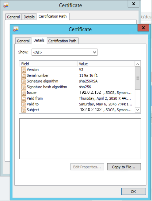 3. From the new certificate window select the Details tab and copy to file.