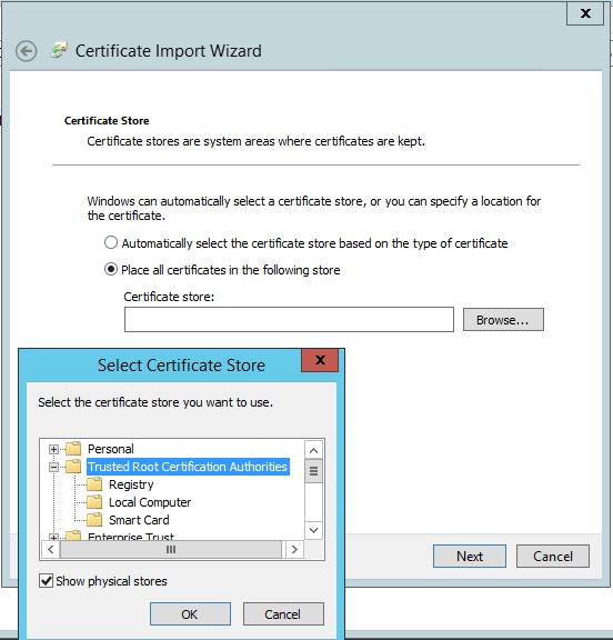 8. When the Import wizard opens click next through the prompts until you get to the certificate store.