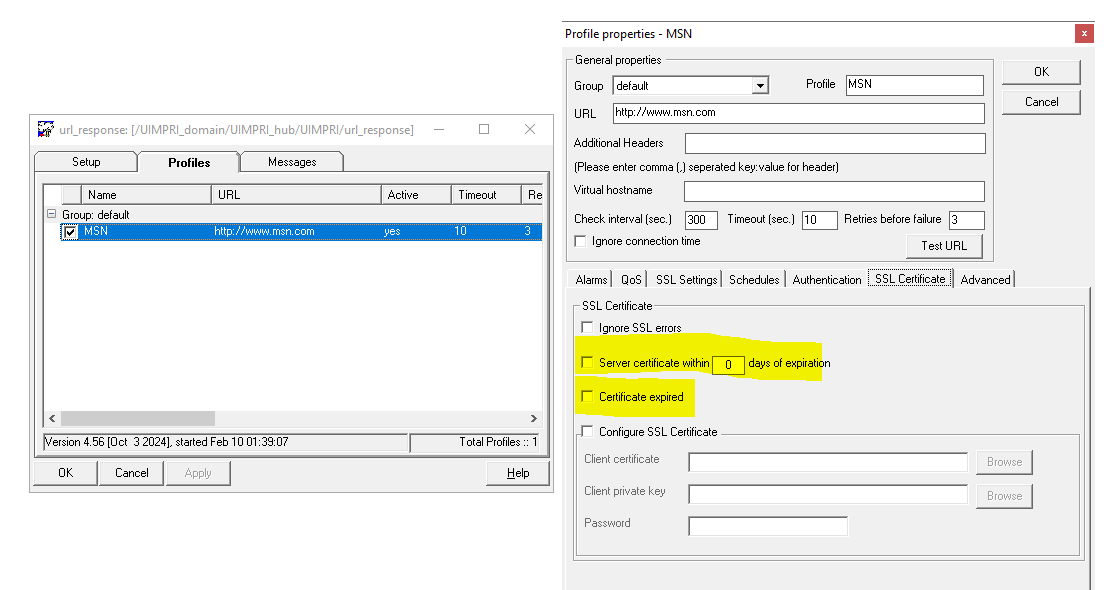 Is there an a option with url_response probe to monitor certificate expiration and trigger alerts?