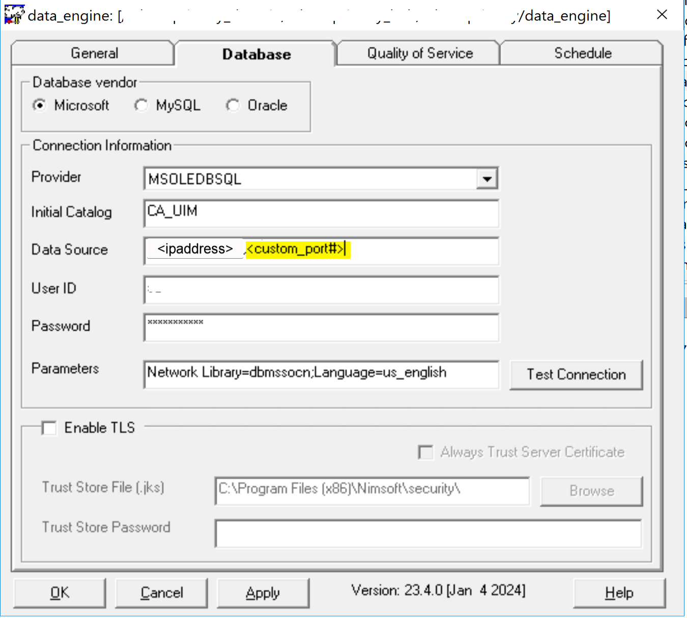 This would be changed in the data_engine configuration GUI or Raw configure on the Data Source line of the Database tab, with a comma after the ip address, e.g.,