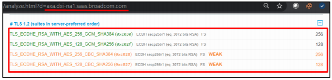 TLS_DHE (DH) and TLS_ECDHE (DH) insecure URL affected: https://axa.dxi-na1.saas.broadcom.com/