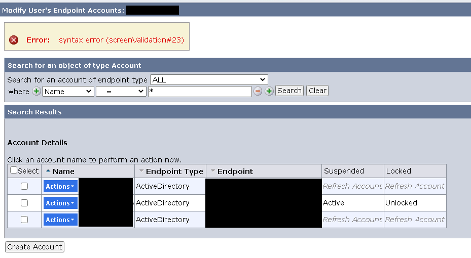 Hello Whenever I try to do a modification or view of a users endpoint account i get Error: Syntax error (screenValidation#23)