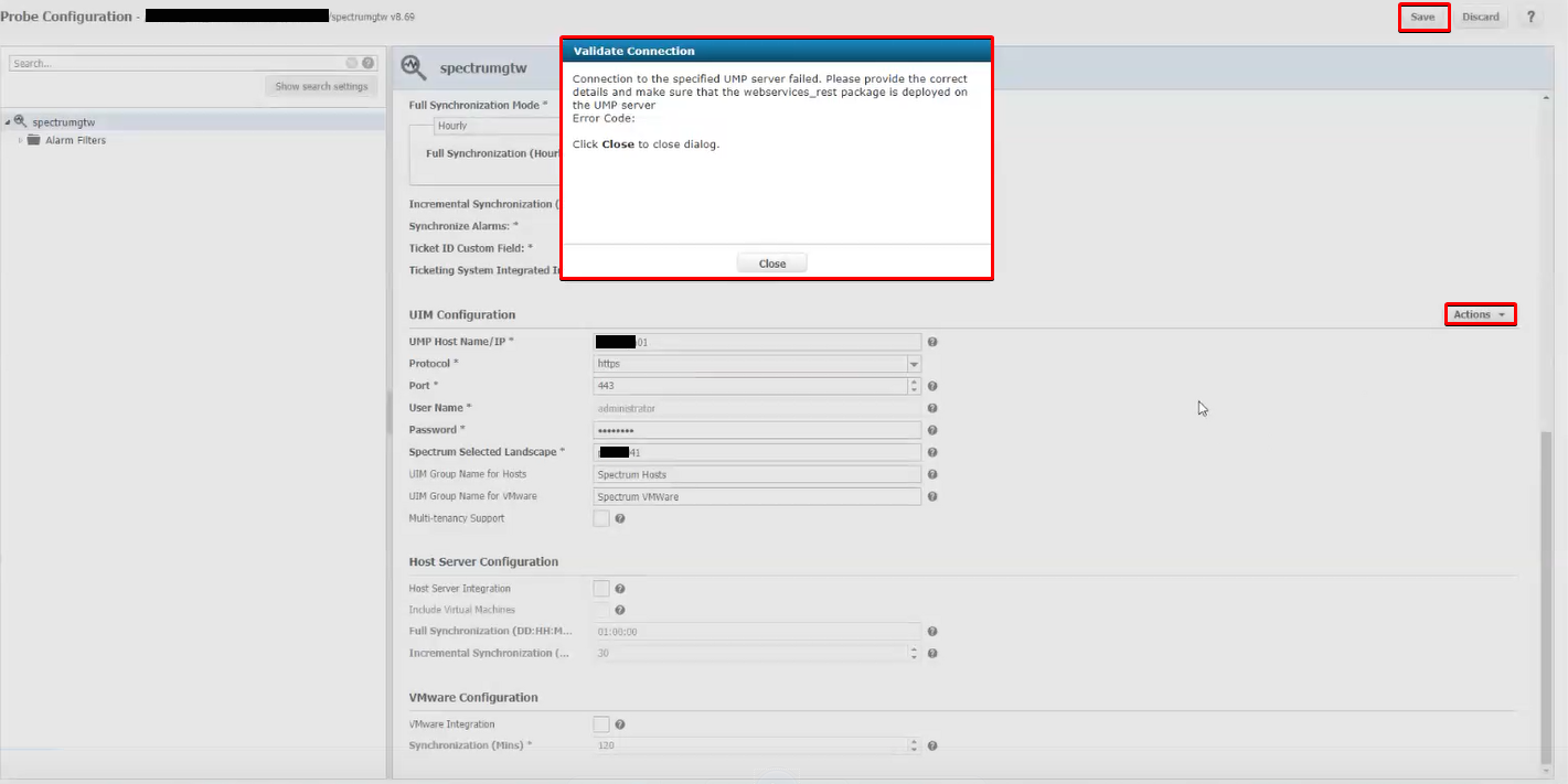 When configuring the spectrumgtw probe, we are getting failures when validating the connection to OC, or same error when trying to Save the configuration. We have the webservices_rest package deployed to the UMP/OC server. Our validation to the Spectrum environment is successful.