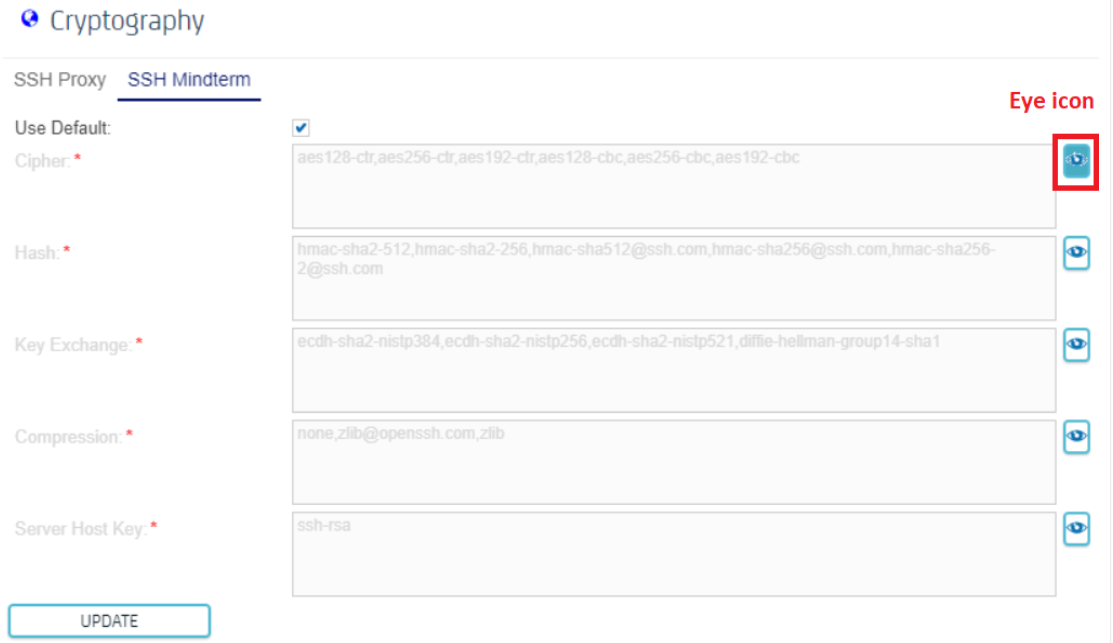 To find supported SSH Mindterm and SSH Proxy Cipher Suites, you can go to Configuration > Security > Cryptography > SSH Proxy/SSH Mindterm page, click the 'eye' icon to the right of each Cipher/Hash/Key Exchange/Compression/Server Host Key box.