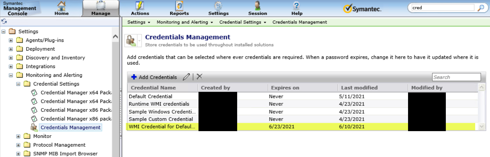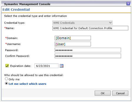The Expiration Date for the "WMI Credential for Default Connection Profile" had been accidentally enabled as shown here: