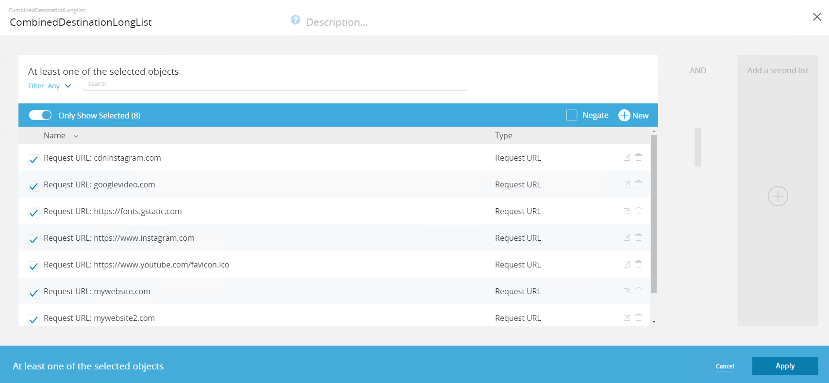 Combined destination long list of URLs objects: