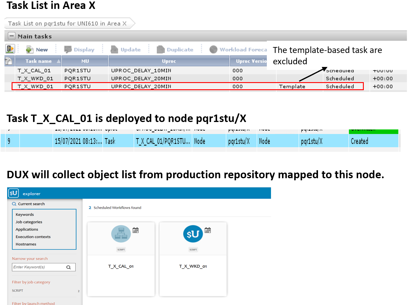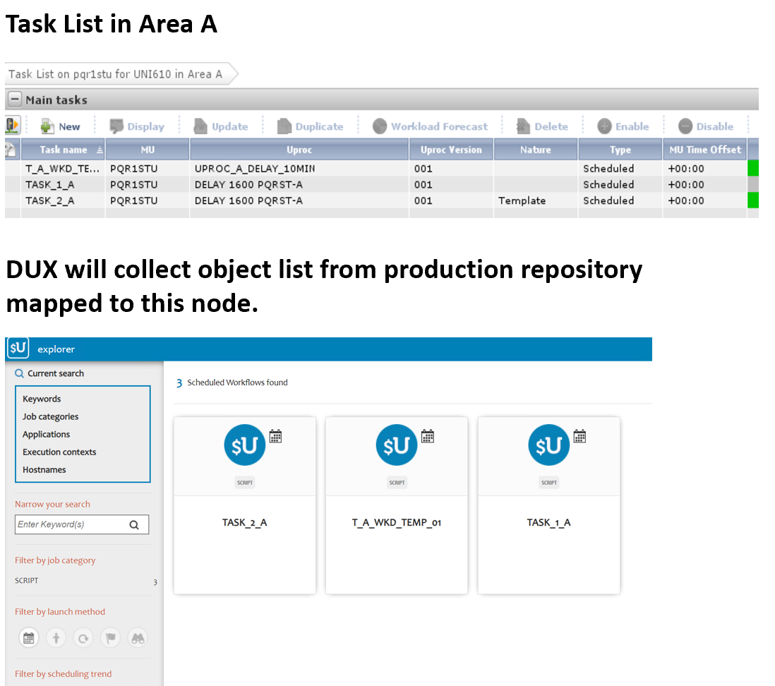 Dollar Universe Explorer will search on the repository for the definition of all objects associated to the tasks (templates or not) declared on the repository. On the production nodes, it will only collect the list of non-template tasks that come from the deployment of repository template tasks.