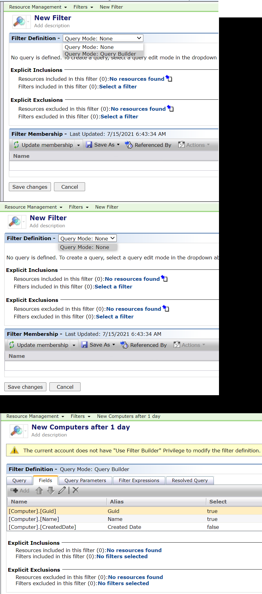 The current account does not have "Use Filter Builder" Privilege to modify the filter definition.