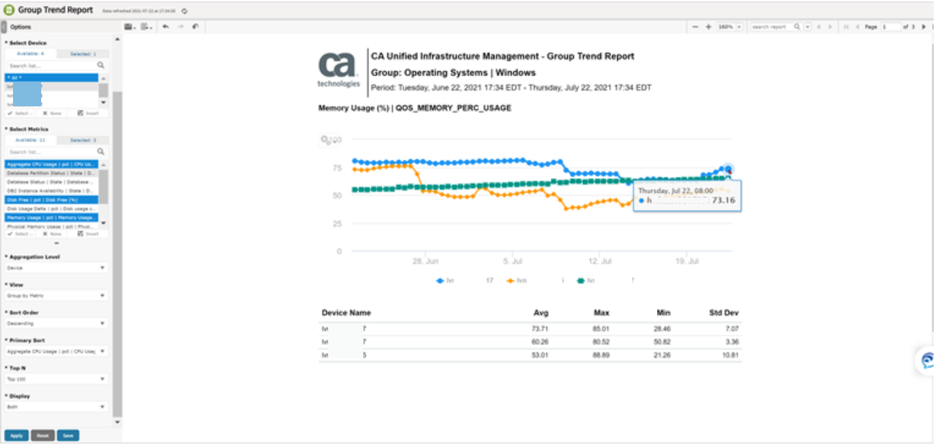 Note that Group Trend Reports list the devices with an average, min, max and standard deviation metric values.