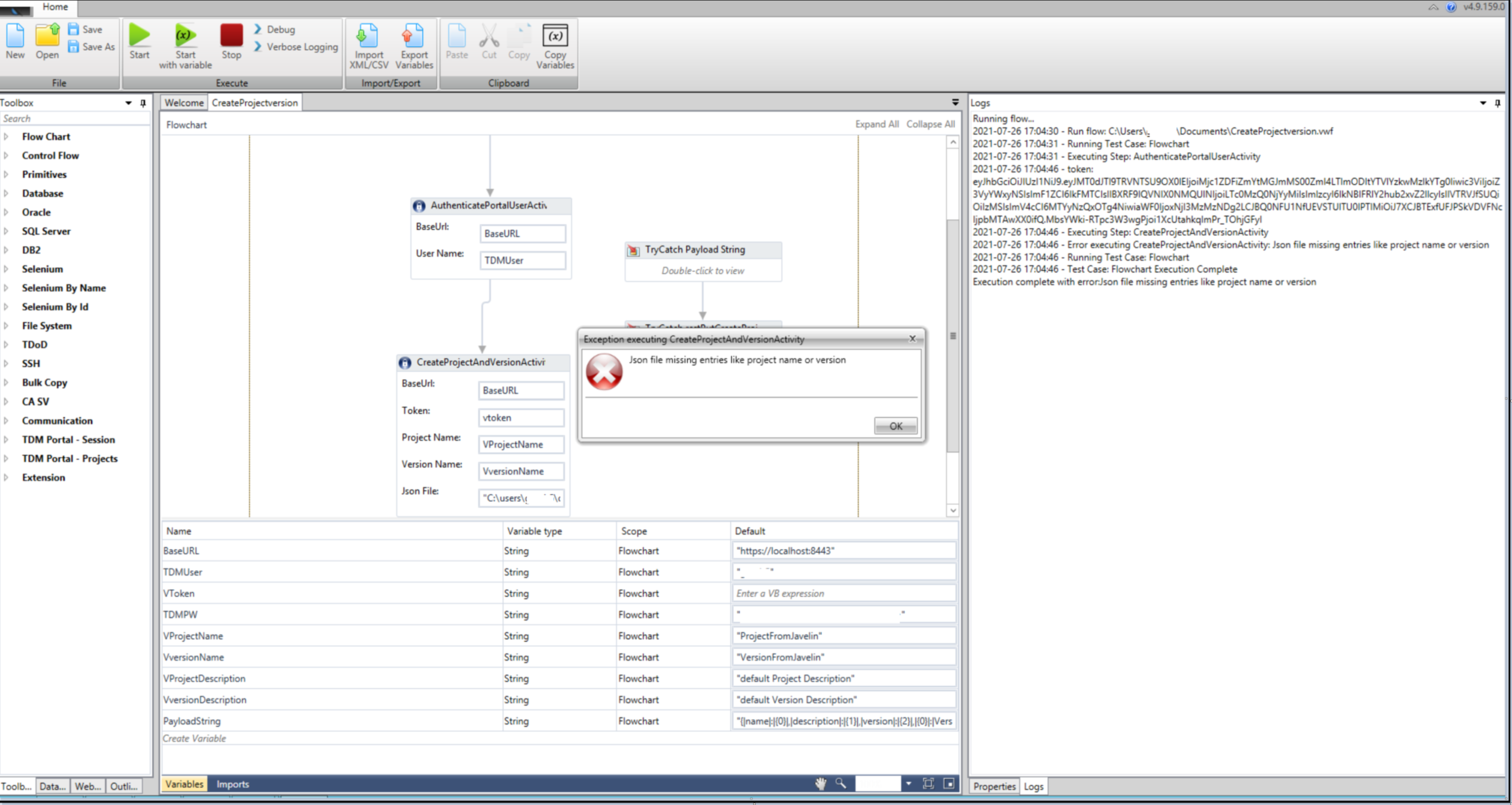 The Swagger UI of the Payload didn't work, and it's not very clear on what is required. If using the JSON found in the UI (using developer tools in Chrome Browser) worked for the file. There seems to be a mismatch of JSON. In the step created in Javelin, Why is it needed to use both a file and the project name and version name arguments?