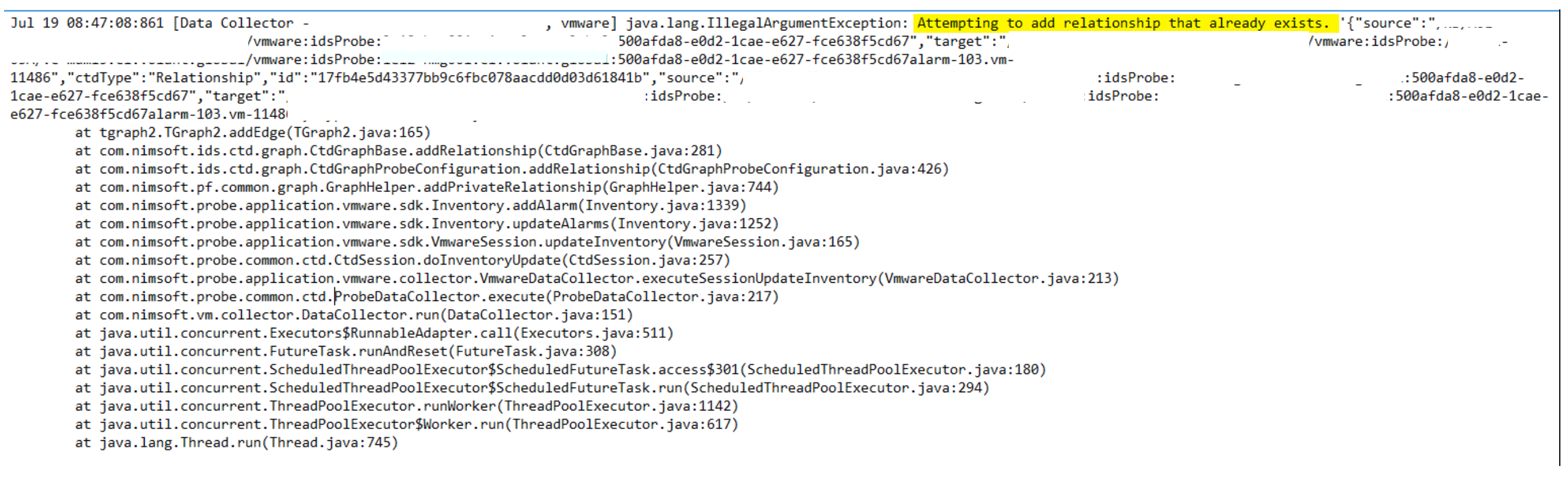 We currently have 4 VMWare instances collected by the VMWare probe, but twice now on one instance the metrics stop being collected, we have seen the following message in the log: