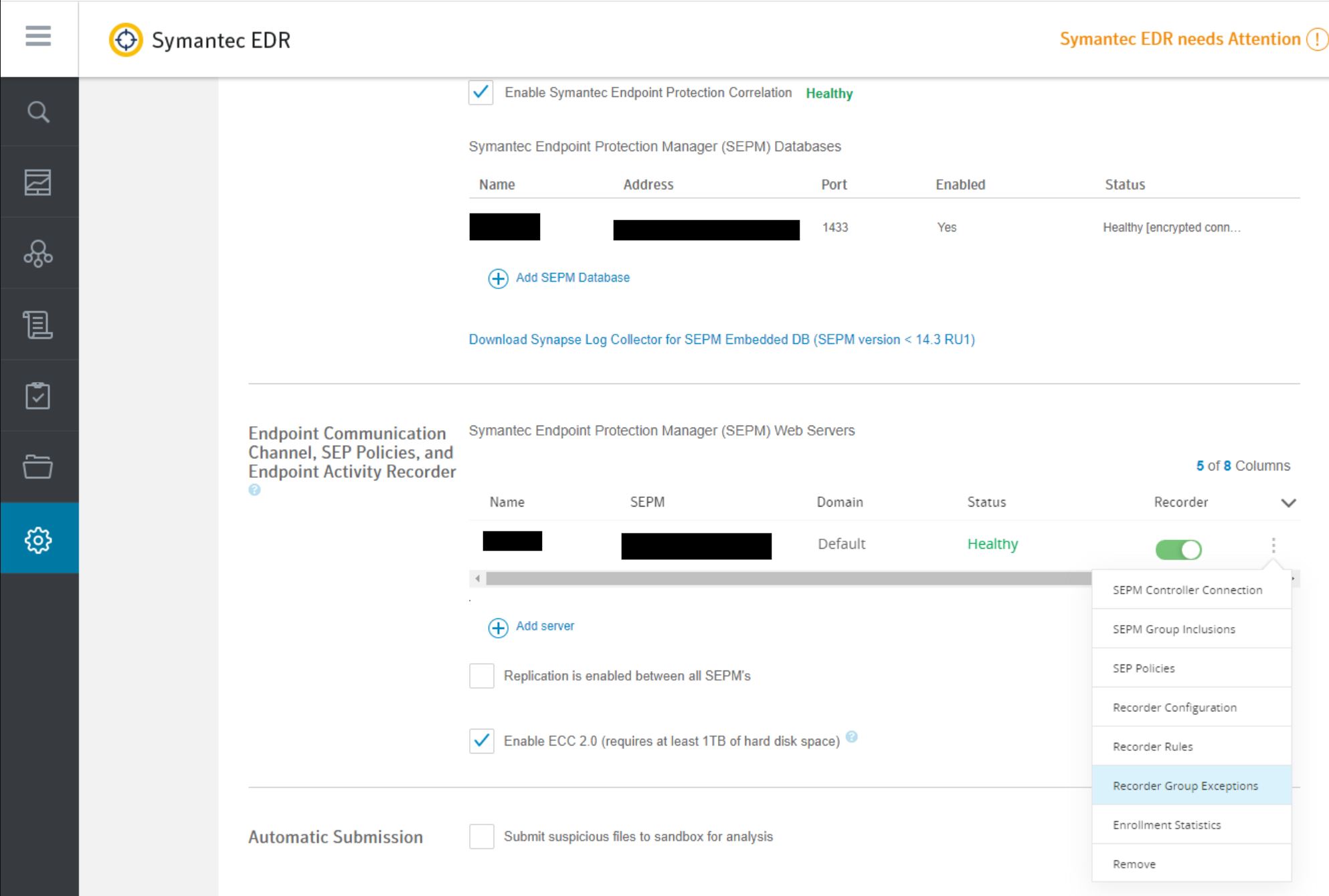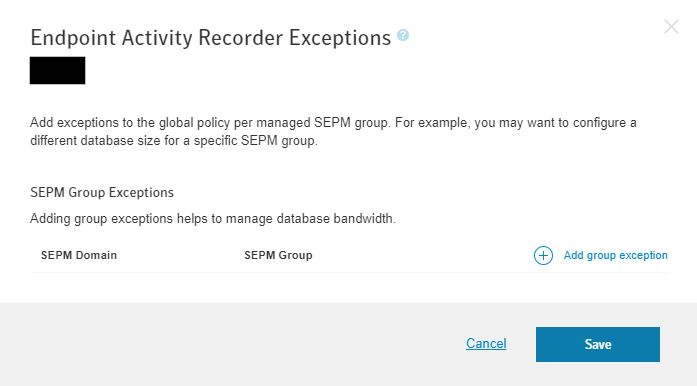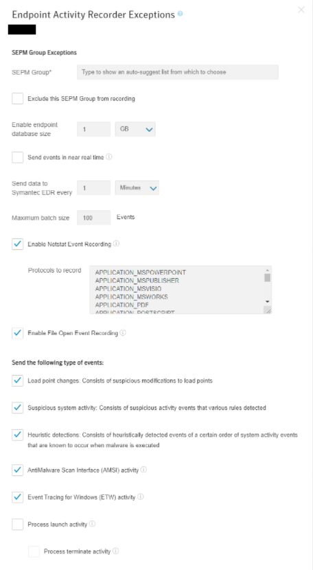 Go to the Endpoint Communications Channel, SEP Policies and Endpoint Activity Recorder in your EDR Settings. Click on the three dots and select Recorder group exceptions.