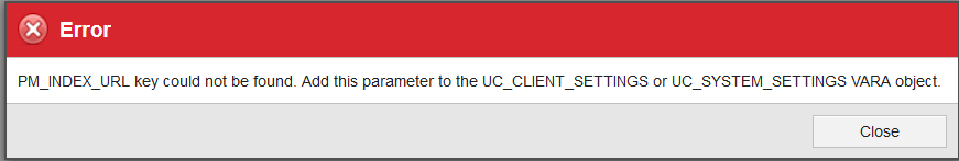 PM_INDEX_URL key could not be found. Add this parameter to the UC_CLIENT_SETTINGS or UC_SYSTEM_SETTINGS VARA object.