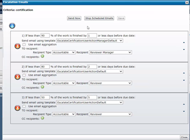 In IG go into your IG certifications and \Administration tab. Click "Escalation Emails" button on the \Administration tab (at bottom, you will see the button behind the "Escalation Emails dialog"