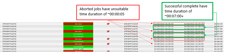 As viable in Job Run summary, the cause of Jobs getting aborted is due to invocation of Job with inappropriate timeframe, which doesn't let job to complete.