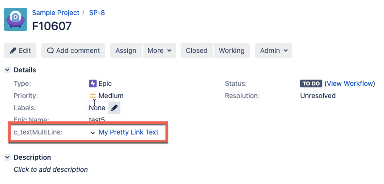 When using the Rally adapter for Jira, many customers may want to configure a field in Jira that provides a way to navigate back to the linked Rally item. A JIRA URL field can be used, but then the entire URL is exposed and it may look unappealing. Some customers prefer to have a hyperlink format where they provide more user friendly link text with a hyper link to the item. This can be done using a multi-line text or text field in Jira.