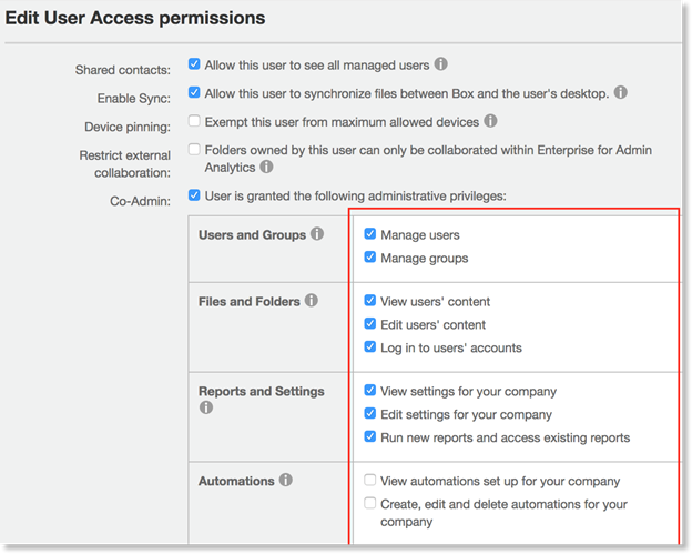 This is how the Co-Admin User privs would look like in Box User Configuration: