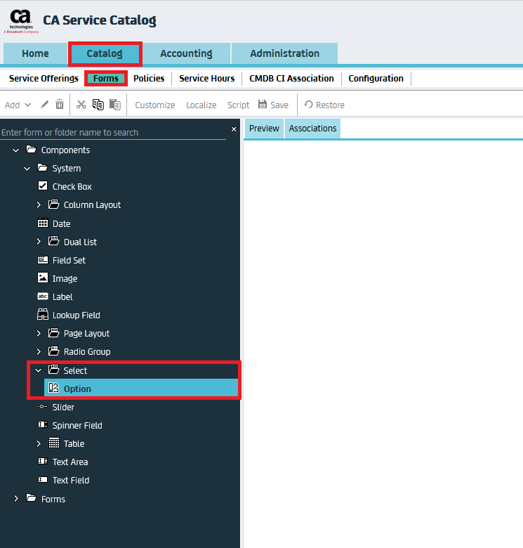 Access Service Catalog as an Admin user, under tab "Catalog", sub-tab "Forms". Expected elements highlighted in red