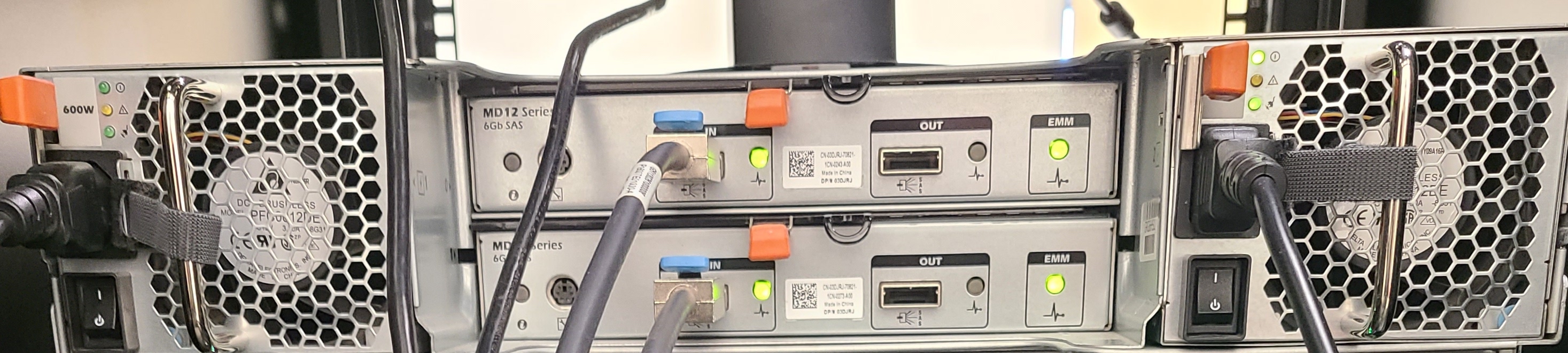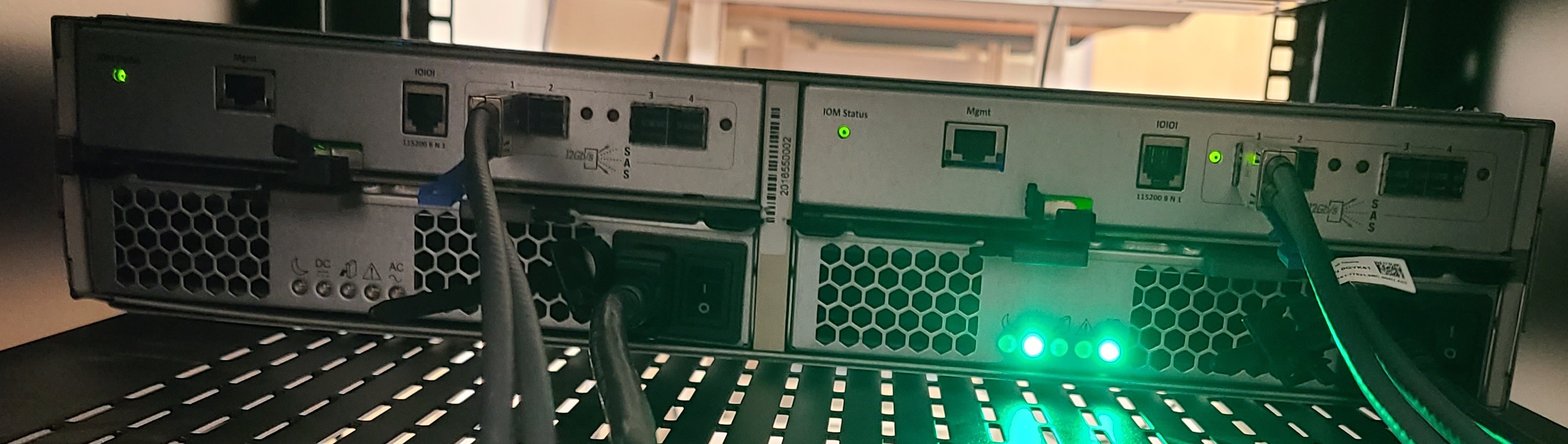 For the Dell MD1400 drive enclosures, the lights are in the top left or top right corners, above the power cords. The top left in this case has no power while the top right lights show there is full power. The power cord on the left is not in tight. If the bottom light is on, the power cord is plugged in but the power switch is off. The power status would need to be checked from the iDRAC.
