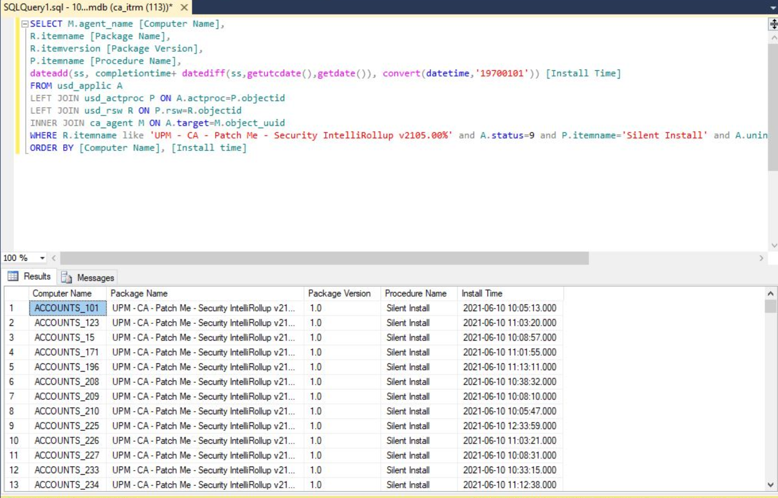 WHERE R.itemname like 'UPM - CA - Patch Me - Security IntelliRollup v2105.00%' and A.status=9 and P.itemname='Silent Install' and A.uninstallstate<>2