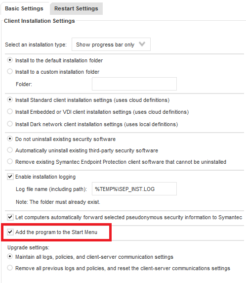 When creating the install package, the 'Add the program to the Start Menu' option was deselected in the selected install settings. This option to add SEP to the Start Menu is enabled be default.