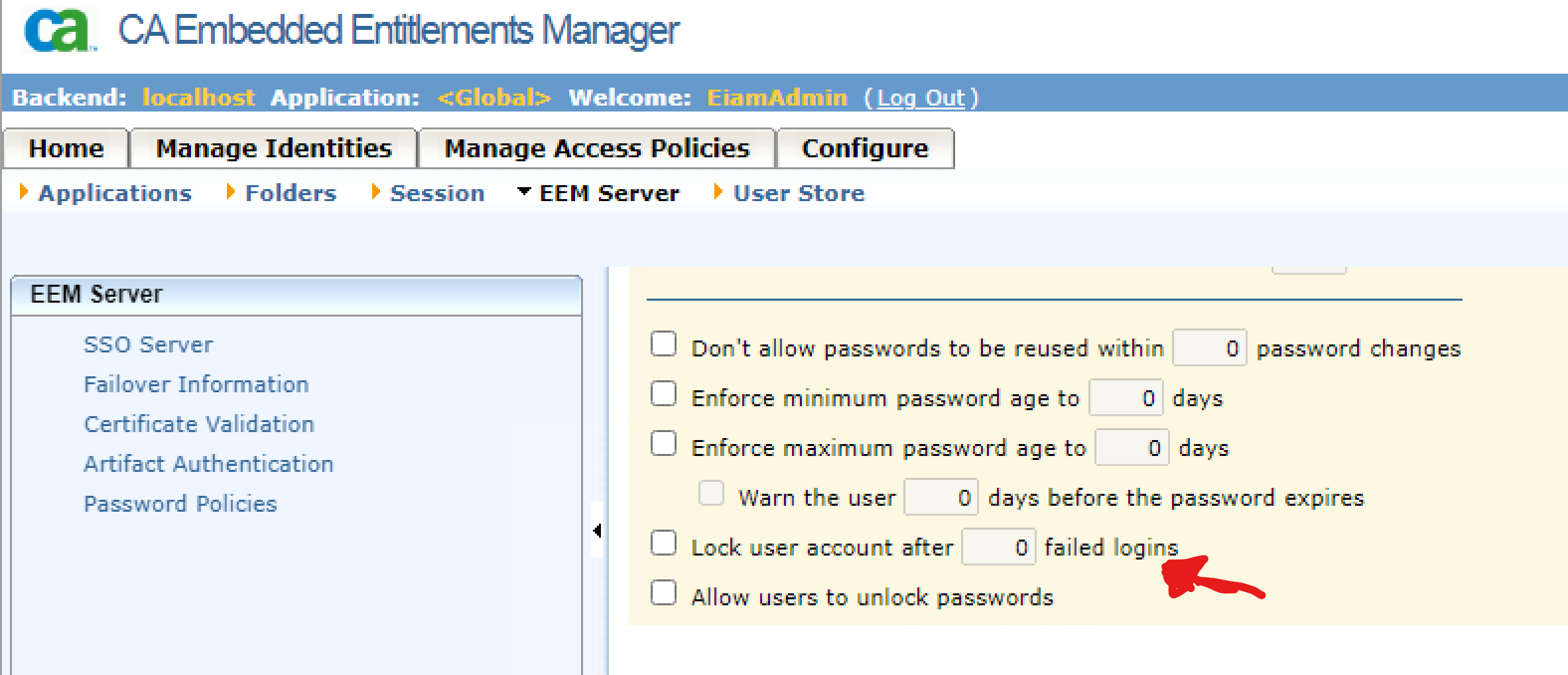 How to configure the number of incorrect login attempts before the user account is locked using EEM internal store