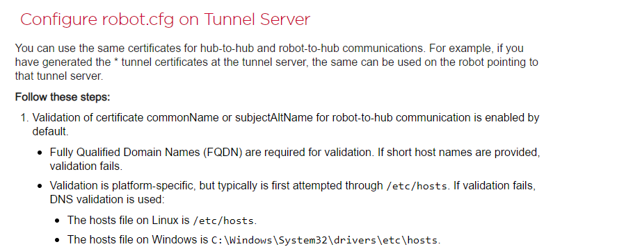 In the case of a third party/CA Signed certificate, the server may have an external name e.g. (hostname.example.domain.com) and an internal name (hostname.example.network.local) and the certificate will have been issued to the external FQDN. The robot would be checking the internal FQDN. So in this case you should obtain a new certificate where the SubjectName is the external FQDN, and the SubjectAlternateName is the internal FQDN. This will allow the same certificate to be used for the tunnel server and the robots.
