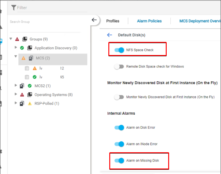 NFS Space check and Disk Missing alarms are supported as of cdm v6.60 or higher.