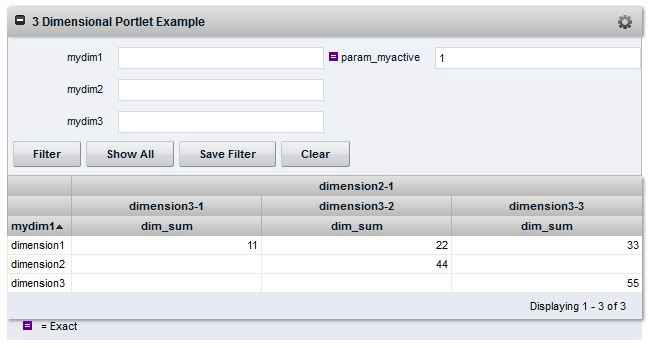 Below you can see how the portlet behaves with different filters. A value of 1 or 0 must be entered for the Active parameter due to the configuration of the WHERE clause. You can modify the clause to accept no value for the filter and results can be returned for both values. This is just one example of how you can configure a three dimensional portlet to suit your needs. For more information, reference the Studio Guide.