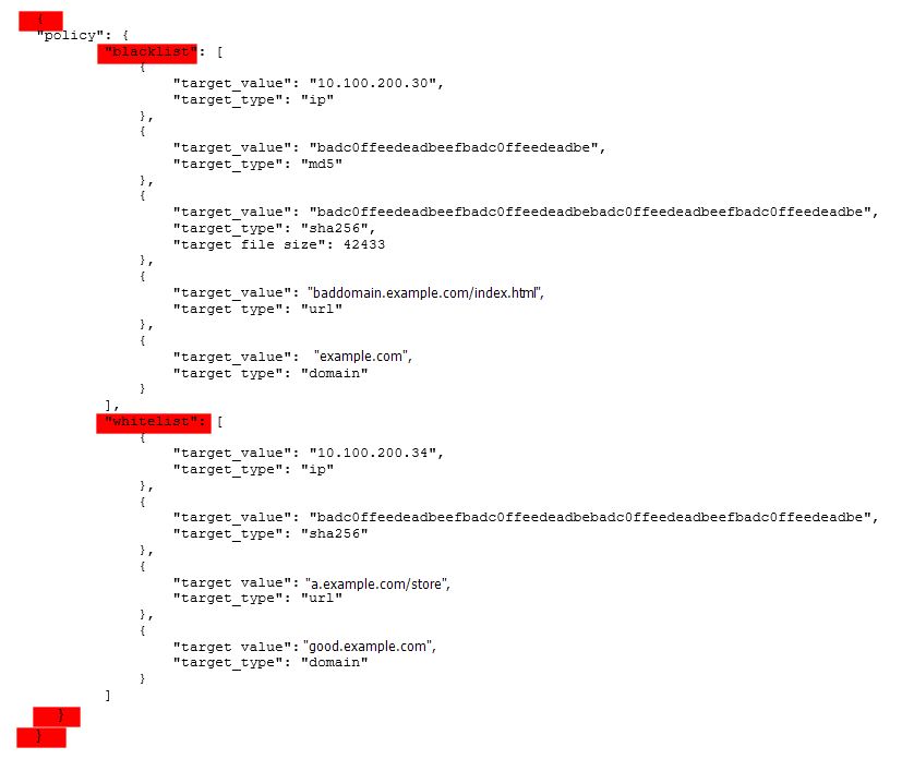 Manually enter a few EDR Deny or Allow list policies in the EDR. Then, export your the JSON policy to determine if your JSON file contains a "blacklist" or "whitelist" tags.