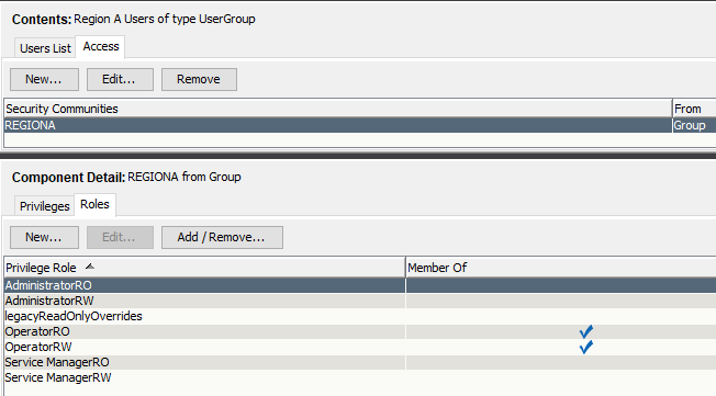 Step 2: Create a new "REGIONA" Security Community for the User or User Group model to associate to the "REGIONA" Security String on the RegionA LAN. It is recommended to use User Groups to make the administration of Users easier. Either create a new User Group or select an existing User Group in the Users tab. Select the User Group and click on the Access tab in the Contents panel. Remove any existing Security Communities and create a new one called "REGIONA".