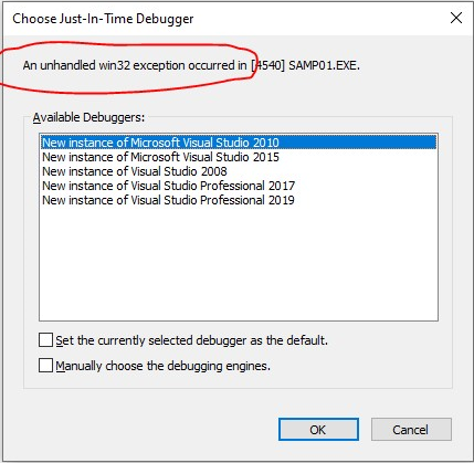At runtime, if the Dynamic MFC PTF RTN86217 / LU03130 is applied but the application window manager has not been re-built, the following exception may occur: "An unhandled win32 exception occurred..." (screen shot below). If the Just-In-Time Debugger is not installed, no error will be seen; the application simply will not execute or open.