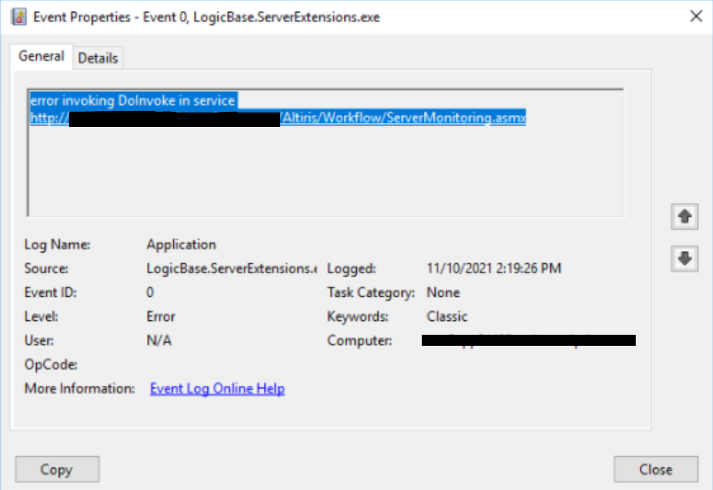 error invoking Dolnvoke in service http://<FQDN of NS>/Altiris/Workflow/ServerMonitoring.asmx