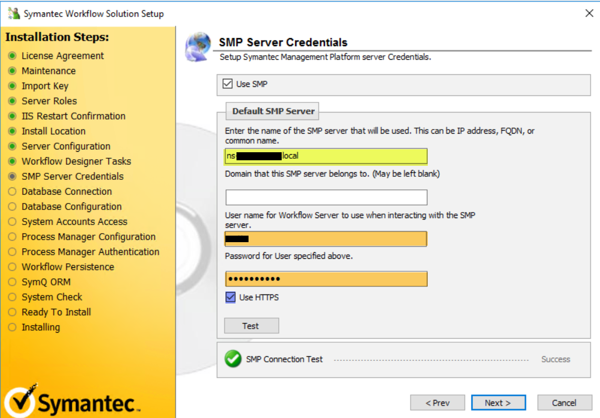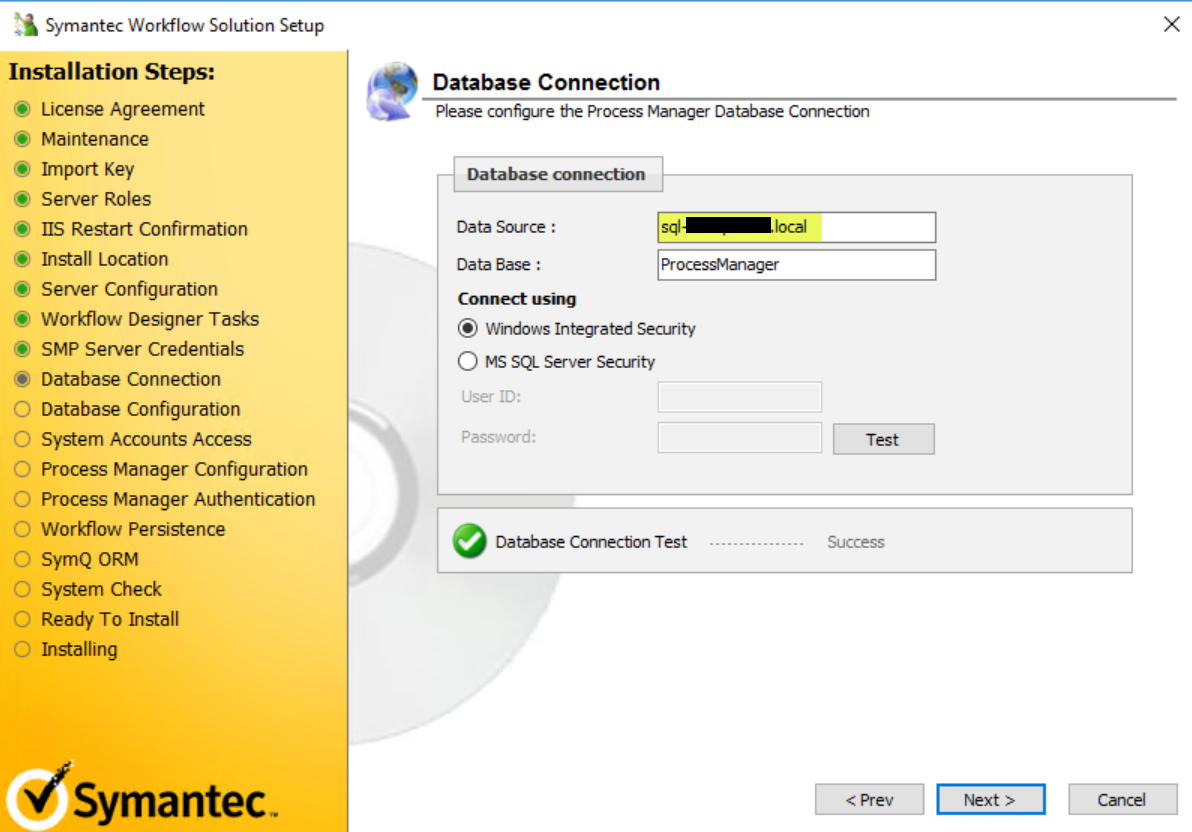 9. On the Database Connection page, enter the FQDN of the SQL server, choose the method to Connect, and then Test the connection:
