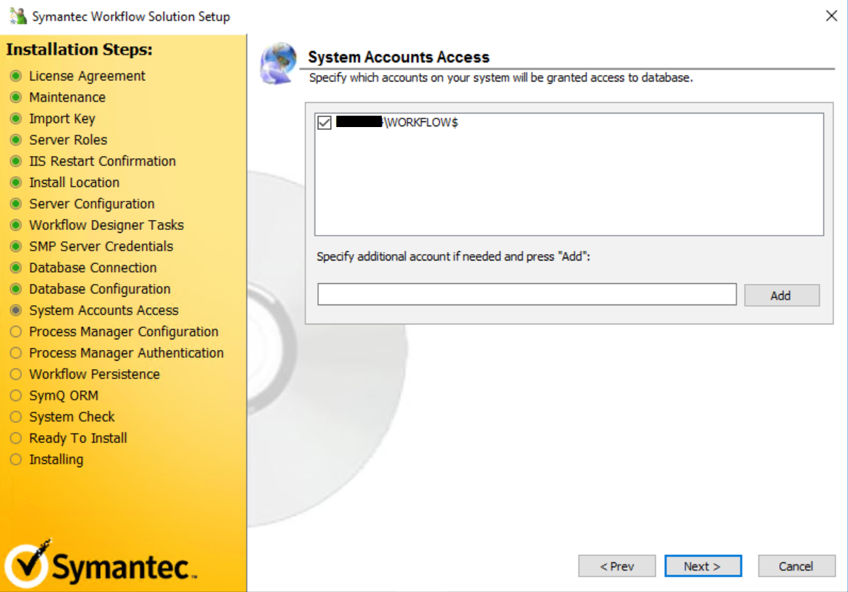 11. On the System Account Access, specify which accounts on your system will be granted access to the database: