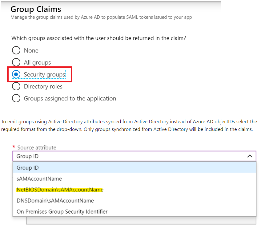 Add group claims within Azure SAML IDP server using options below that adds the Active Directory attributes synced from Active Directory instead of Azure AD objectIDs. In our case, we selected the 'NetBIOSDomain\sAMAccountName' format from the drop-down so that the info passed in matched the Group names within Cloud SWG configuration.