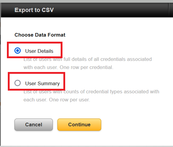 the User Detail report lists each credential assigned to a user on a separate row and contains these details: