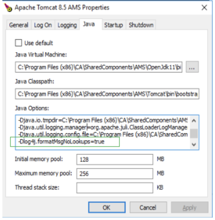 You can upgrade to CA Service Management 17.3 RU11 with the upgraded Log4j2 version of 2.16.0 to fix the security vulnerabilities affecting the Apache Log4j utility. For more information on installation of CA Service Management 17.3 RU11, refer